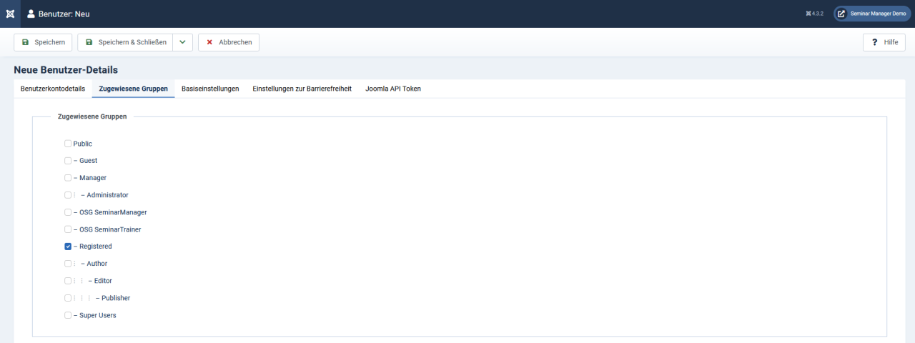Öffnen Sie dazu das Tab "Systeminformationen" in den Systemwerkzeugen des Backends des Seminar Managers. Nach der Aktivierung der Benutzerrollen können Sie beim Hinzufügen neuer Benutzer (in Joomla) diesen die Rechte "OSG SeminarManager" oder "OSG SeminarTrainer" zuweisen.