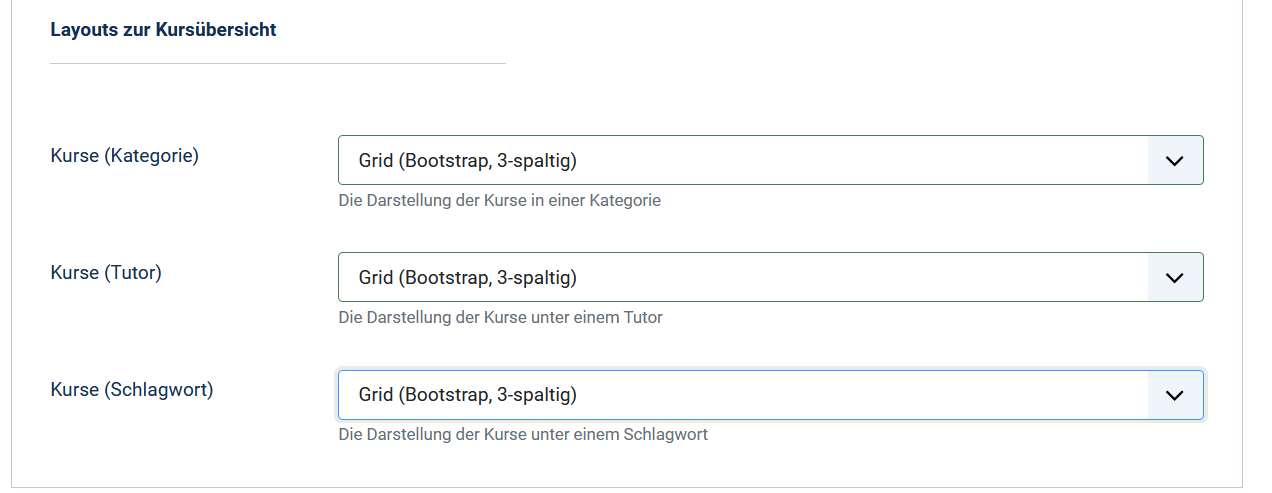 Neuerdings kann das Layout zur Kursübersicht auch im Grid-View ausgewählt werden. Wählen Sie zwischen dem neuen Grid-View (Gitter) oder der bisherigen Tabellen-Übersicht, um das Layout für Kategorie, Tutor und Schlagwort im Frontend anzuzeigen.